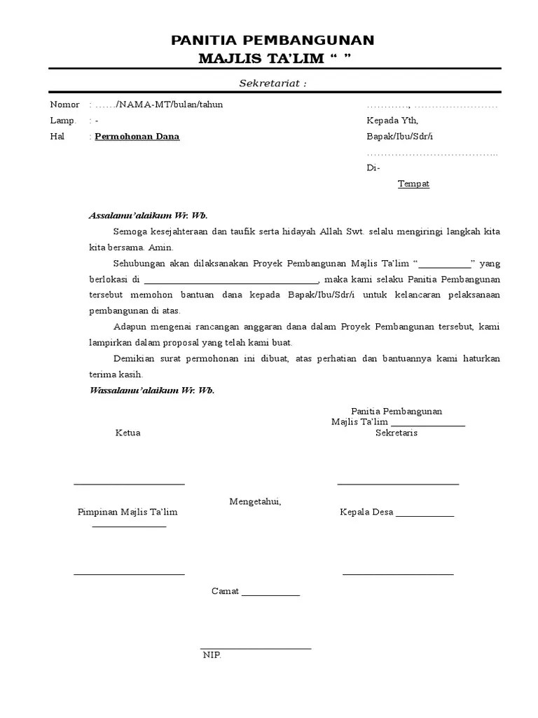 Panitia peringatan isra mi'raj nabi muhammad saw majlis ta'lim " " sekretariat : Cibungur rt oo2 rw olo kelurahan setiawargi kecamatan tamausari rota. Unduh sebagai doc pdf txt atau baca online dari scribd. Mendukung serta mendorong pembangunan musholah dan majlis ta'lim ulul. Proposal pembangunan majlis ta'lim adalah suatu surat usulan kegiatan berbentuk jilidan yang diterangkan dalam bentuk rancangan kerja secara .